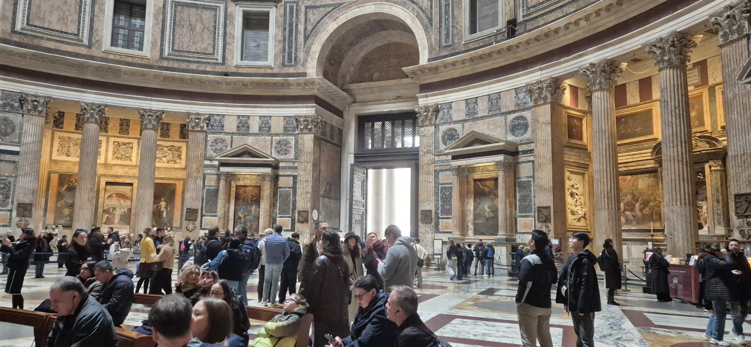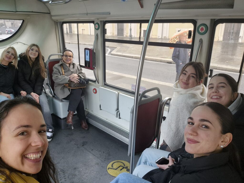 Am Sonntag, 1. Februar, trafen wir uns alle gemeinsam am Flughafen Zürich und flogen nach Rom. Nach der Ankunft wurden wir mit Taxis zu unserem Hotel gebracht. Das Hotel lag sehr zentral, in der Nähe des Termini Bahnhofs, wodurch wir gute Bus- und Verkehrsanbindungen hatten. Nach dem Einchecken hatten wir zunächst Zeit zum Ankommen und Einrichten. Am Abend assen wir zusammen eine Pizza und hatten danach den Abend wieder für uns. Von Montag bis Freitag gingen wir jeweils individuell zum Morgenessen. Nach dem gemeinsamen Programm am Vormittag konnten wir den Nachmittag für uns nutzen. Am Abend trafen wir uns wieder zum gemeinsamen Nachtessen, und nach dem Essen stand uns wieder freie Zeit zur Verfügung.